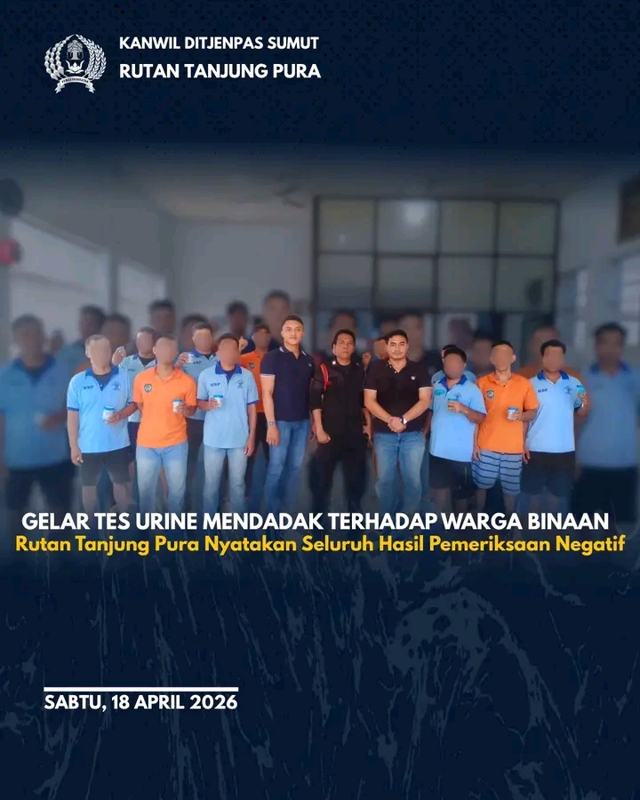 Rumah Tahanan Negara (Rutan) Kelas IIB Tanjungpura kembali membuktikan keseriusan dan komitmennya dalam menjaga lingkungan rutan yang bersih, aman, dan bebas dari segala bentuk penyalahgunaan narkotika, psikotropika, dan zat adiktif lainnya melalui pelaksanaan kegiatan tes urine secara mendadak terhadap Warga Binaan .Kegiatan ini merupakan bagian dari program pengawasan preventif yang dilaksanakan secara rutin dan berkesinambungan oleh Rutan Tanjung Pura sebagai wujud nyata tanggung jawab institusi dalam menciptakan lingkungan pembinaan yang kondusif, tertib, dan bermartabat bagi seluruh Warga Binaan .Sabtu (18/04)