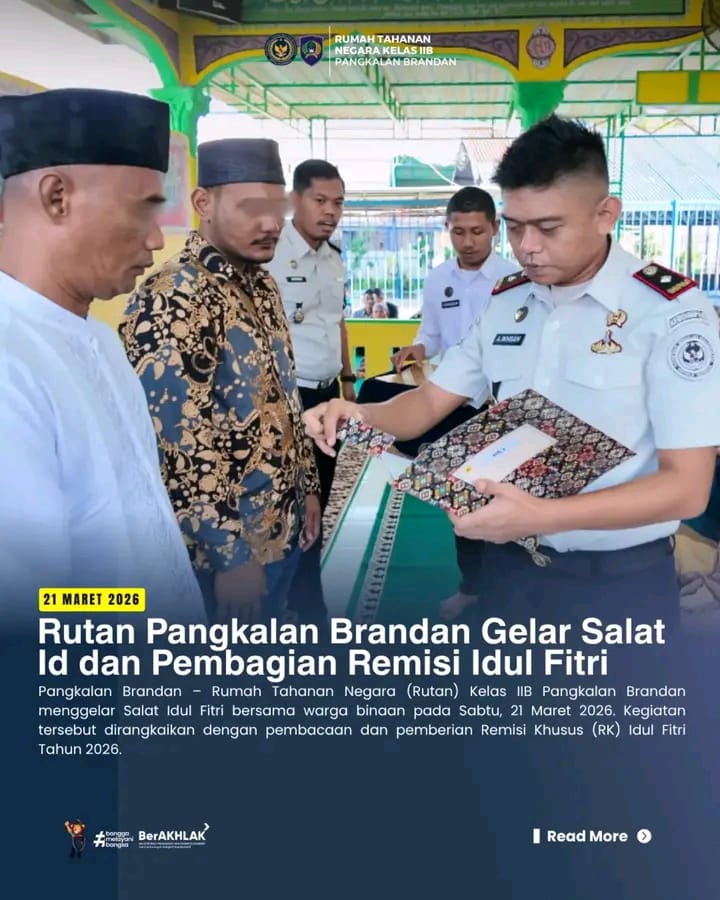 Rumah Tahanan Negara (Rutan) Kelas IIB Pangkalan Brandan menggelar Salat Idul Fitri bersama warga binaan pada Sabtu, 21 Maret 2026. Kegiatan tersebut dirangkaikan dengan pembacaan dan pemberian Remisi Khusus (RK) Idul Fitri Tahun 2026.