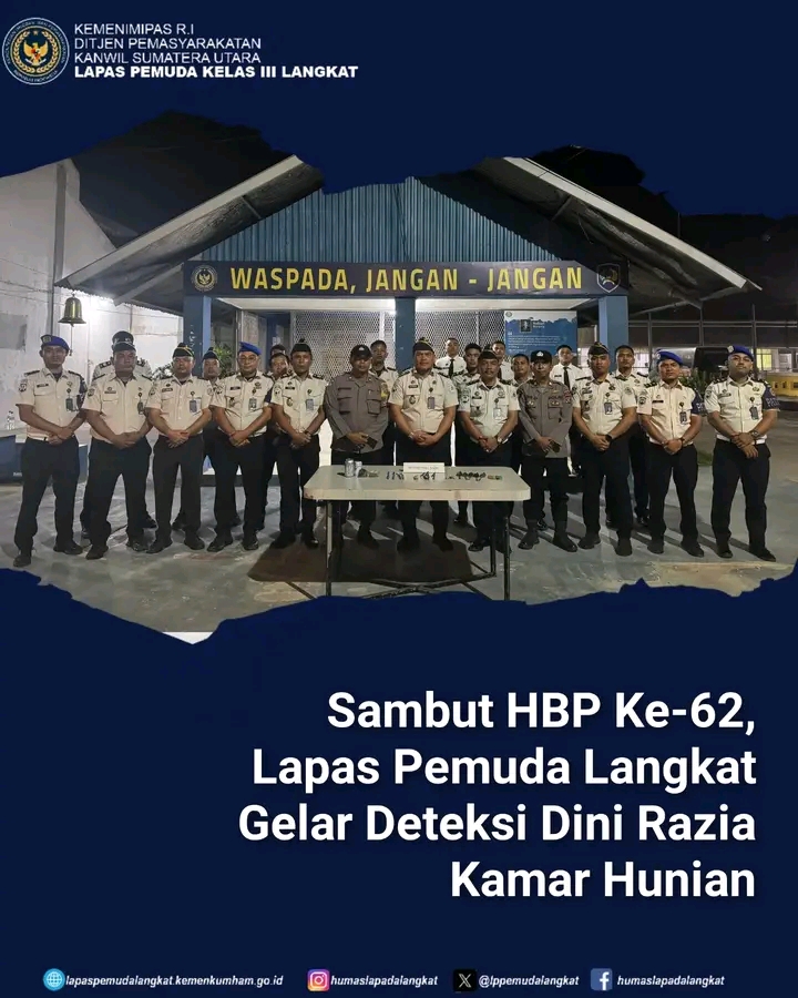 Dalam rangka menyambut hari Bhakti Pemasyarakatan ke-62 dan juga peningkatan keamanan dan ketertiban dalam serta memastikan tidak adanya barang terlarang, Lapas Pemuda Langkat Lakukan Deteksi Dini Razia, Senin (6/4/2026).