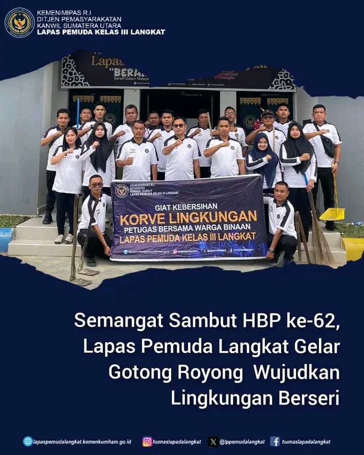 Menyambut Hari Bhakti Pemasyarakatan ke-62, Jajaran Lapas Pemuda Kelas III Langkat menggelar kegiatan bersih-bersih area lapas. Kegiatan ini merupakan bagian dari upaya untuk menjaga kebersihan dan kesehatan lingkungan di sekitar lapas, Sabtu (14/3/2026).