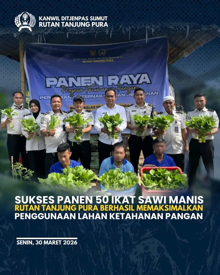 Rumah Tahanan Negara Kelas IIB Tanjung Pura kembali menunjukkan komitmennya dalam mendukung program ketahanan pangan nasional melalui kegiatan panen sawi manis yang dilaksanakan di lahan pertanian Ketapang. Kegiatan yang berlangsung penuh semangat ini dipimpin langsung oleh Karutan Tanjung Pura, Fransisco Pandia didampingi seluruh jajaran pimpinan dan petugas Rutan Tanjung Pura. Senin (30/03)