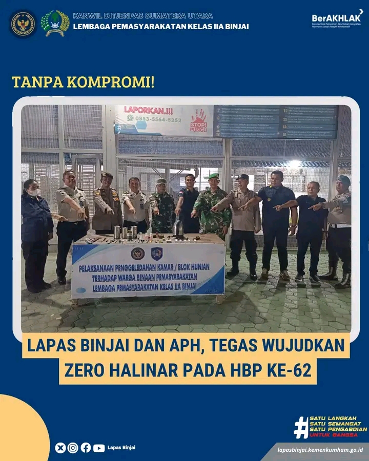 Dalam rangka menyambut Hari Bakti Pemasyarakatan (HBP) ke-62, Lembaga Pemasyarakatan (Lapas) Kelas IIA Binjai melaksanakan razia gabungan bersama Aparat Penegak Hukum (APH), pada Senin (06/04/2026). Kegiatan ini merupakan tindak lanjut dari arahan Direktur Jenderal Pemasyarakatan dalam upaya menjaga keamanan dan ketertiban, serta mewujudkan Lapas yang bersih dari Halinar (Handphone, Pungli, dan Narkoba).
